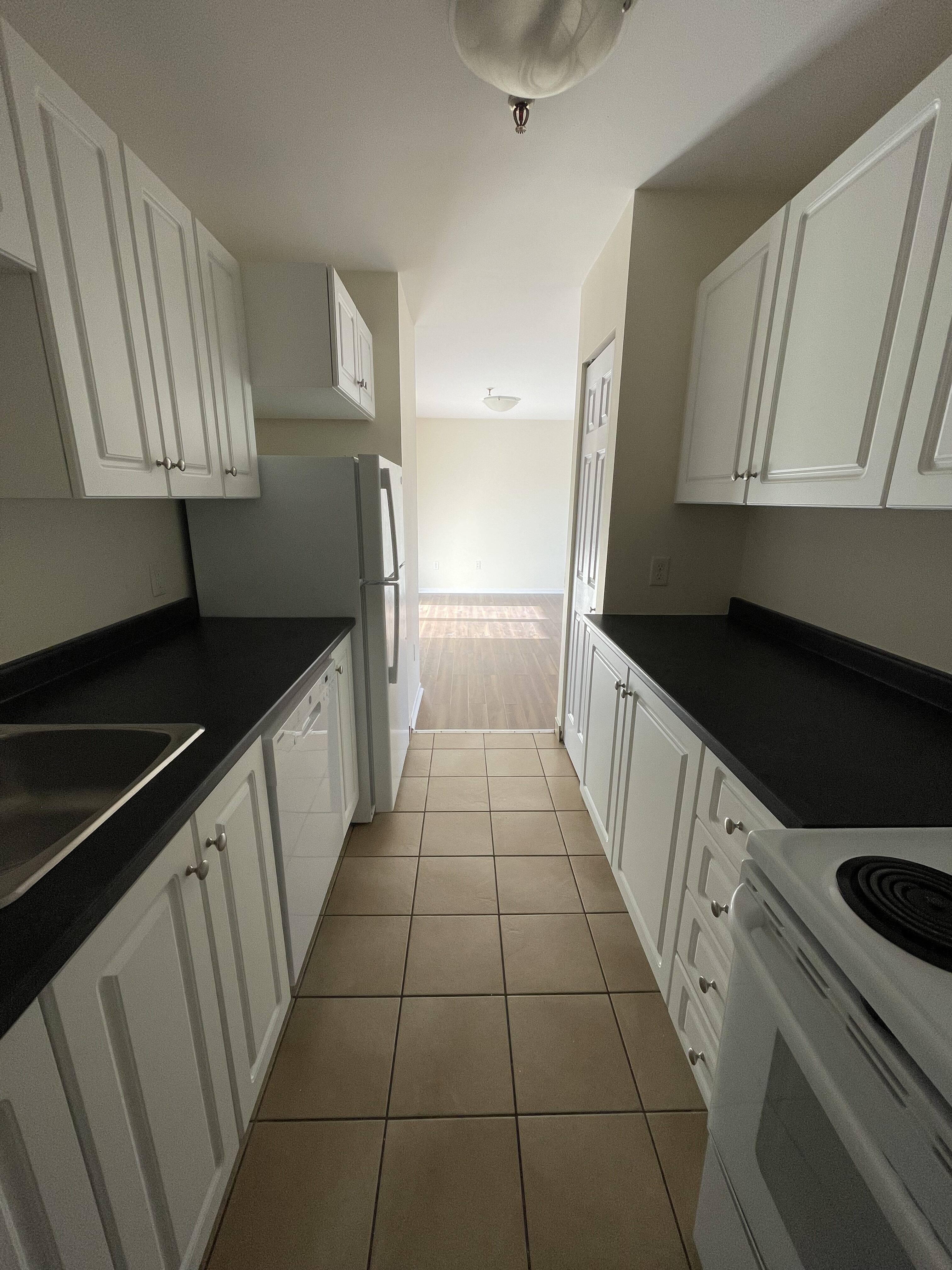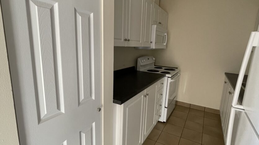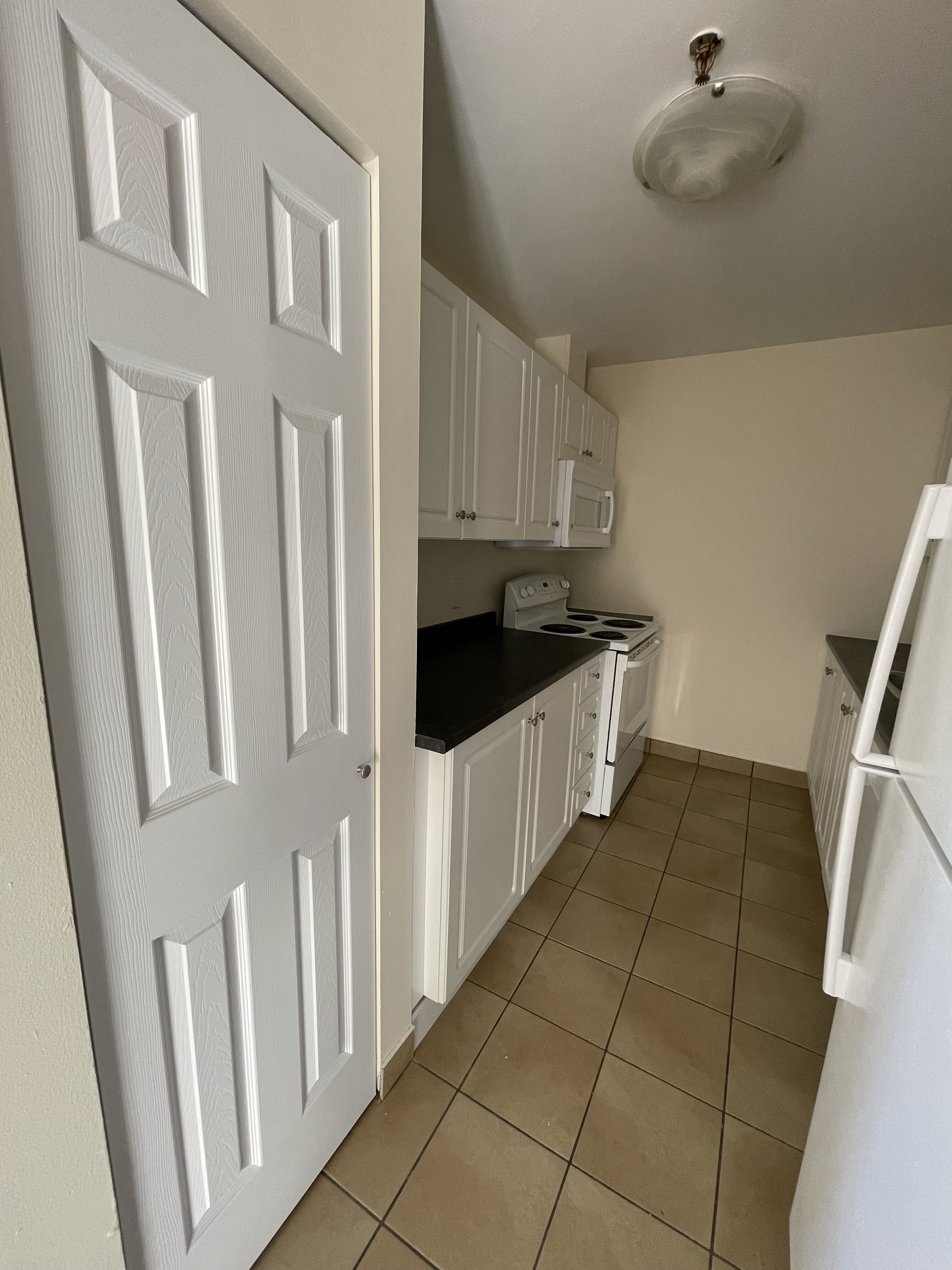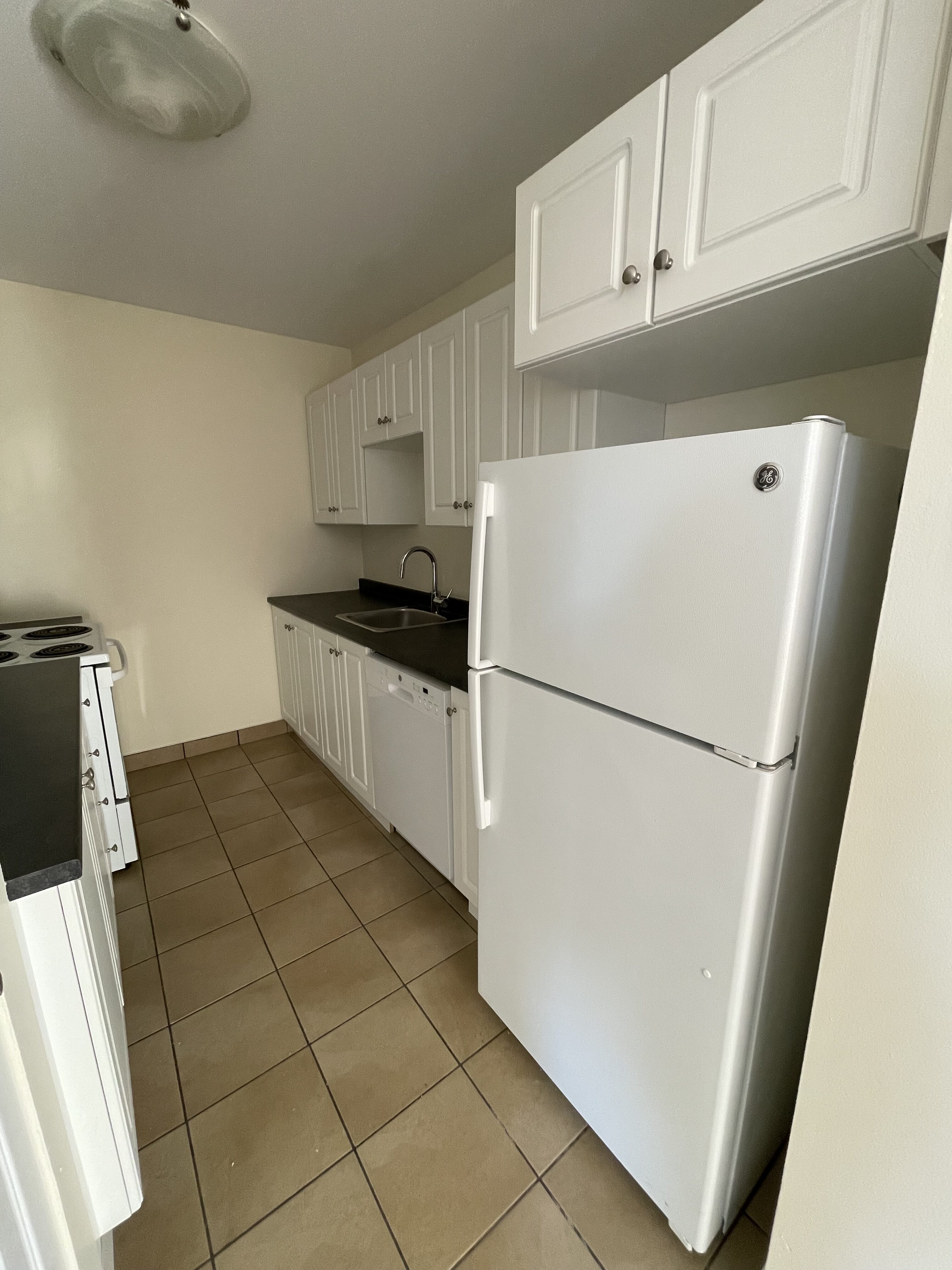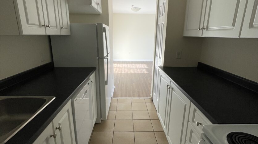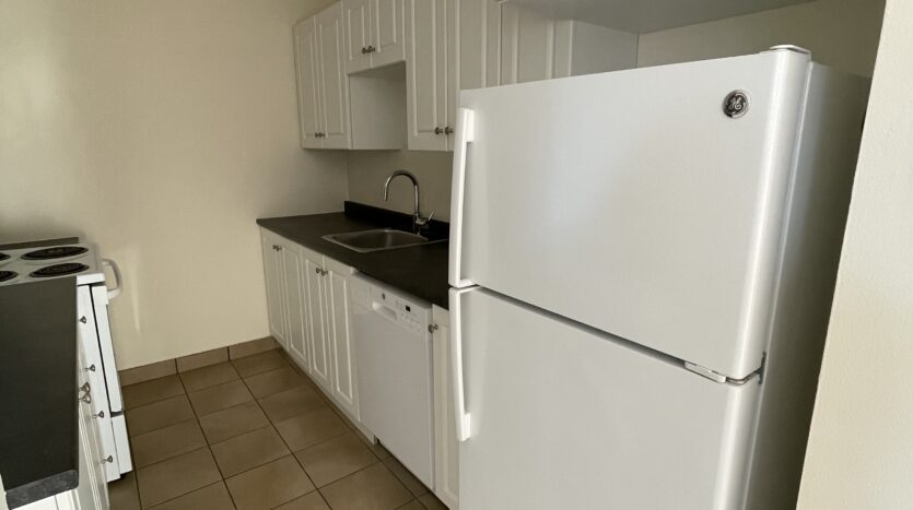 Appliances: Fridge, stove, dishwasher, and microwave.